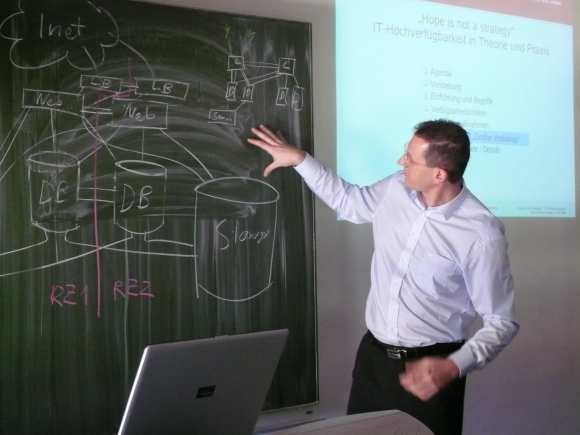 gutem Erfolg abschloss. Angefangen von den Risiken für die Verfügbarkeit wie logischer Korruption, technischen Ausfällen der Hardware und Infrastruktur oder konzeptionellen Schwächen der programmierten bzw. eingesetzten Software vermittelte er anschaulich die Risiken für die geforderte permanente Verfügbarkeit des IT-Systems. Dem schlossen sich die Vorsorgemaßnahmen und Konzepte zur Ausfallsicherheit an wie z.B. gute Mitarbeiterschulung, Auswahl hochwertiger Einzelkomponenten, sorgfältige Planung und detaillierte Tests vor Produktionsbeginn. Dass
